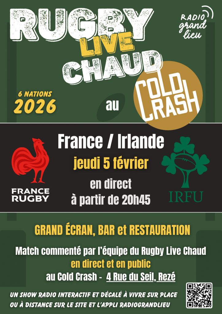 Rejoignez toute l’équipe du Rugby Live Chaud au bar à bières le Cold Crash pour vivre intensément ce choc France / Irlande en direct dans le bar et sur l’antenne de Radio Grand Lieu !